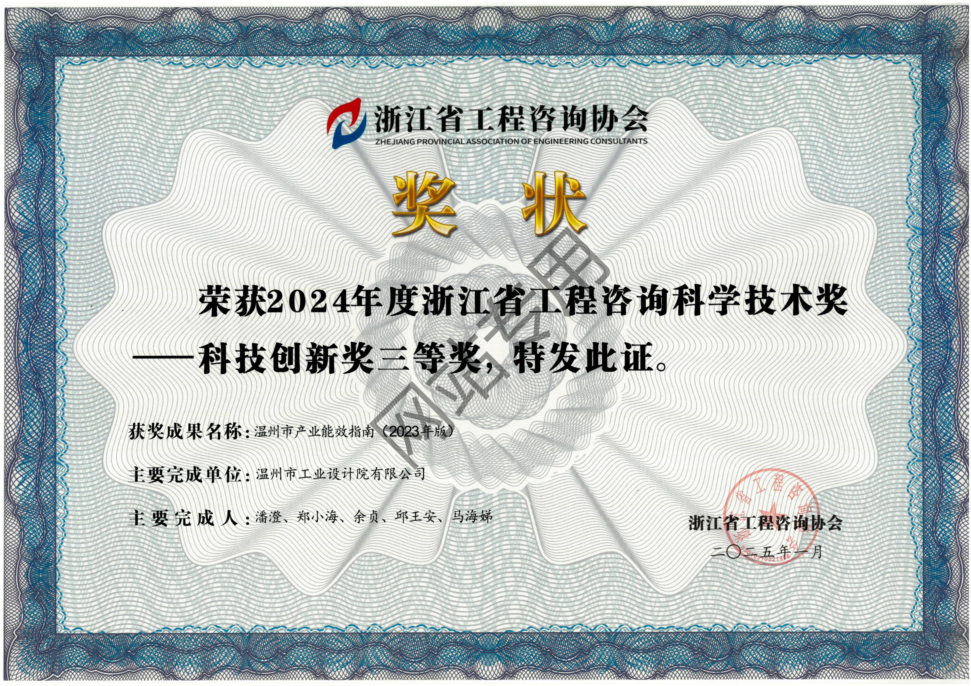 溫州市產業(yè)能效指南(2023年版)項目 2024年度省工程咨詢科學技術獎—科技創(chuàng)新獎獲獎三等獎