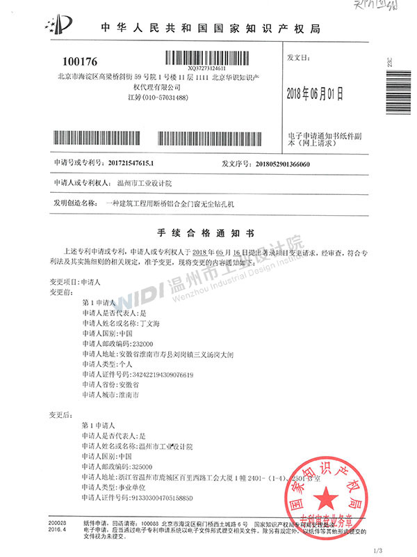 一種建筑工程用斷橋鋁合金門(mén)窗無(wú)塵鉆孔機(jī)手續(xù)合格通知書(shū)(1)