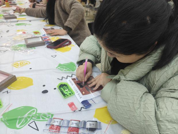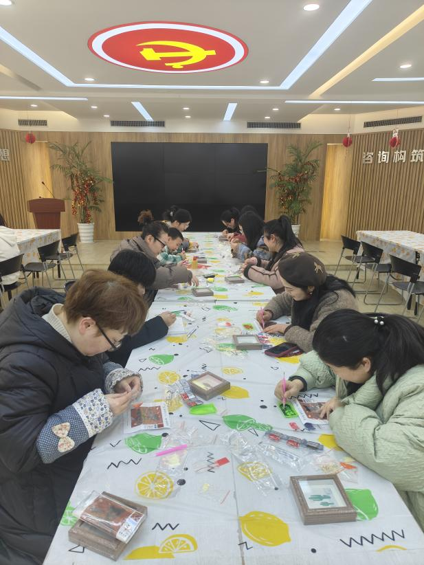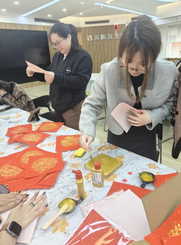 活動現(xiàn)場,布置得溫馨且喜慶,燈籠高掛、春聯(lián)映目、年花簇擁,處處洋溢著濃郁的節(jié)日氣息。全體員工熱情響應,踴躍參加?;顒右潦?,大家有序簽到并領取了手工DIY所需的材料。此次活動準備了多個富有傳統(tǒng)文化韻味的手工項目。福字 DIY 鉆石貼區(qū),員工們專注地將一顆顆閃耀的鉆石鑲嵌在特制模板上,在細致操作中,寓意吉祥的福字逐漸成型;“家和萬事興”“百福圖” 數(shù)字油畫 DIY 區(qū)域,大家依據(jù)數(shù)字標識,用畫筆為畫布填充色彩,每一筆都飽含著對美好生活的期許。木版年畫拓印手工 DIY 處,員工們先將宣紙輕柔覆蓋在刻有精美圖案的木版上,再用蘸滿顏料的刷子均勻刷過紙面,隨后小心翼翼地揭開宣紙,一幅幅承載著歷史記憶與美好寓意的木版年畫便躍然紙上 。經(jīng)過一個多小時的創(chuàng)作,一幅幅精美的手工作品陸續(xù)誕生。這些作品不僅展示了員工們的才華和技藝,更凝聚了大家的智慧和汗水。
